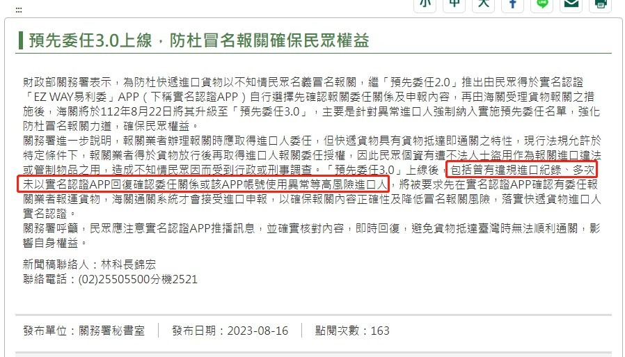 ** 112.08.22通知 ** 只要台灣收件人沒有按申報相符(就是第二個Y),下次進口這個人名就會被取消實名認證資格,貨物來就不能通關,今天開始實施